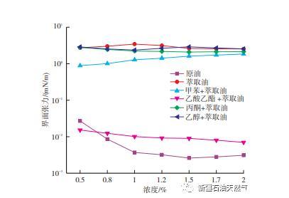 圖4為原油、萃取油以及萃取油分別添加濃度為1%的甲苯洗脫物、乙酸乙酯洗脫物、丙酮洗脫物、乙醇洗脫物配成的模擬油與0.5%,0.8%,1%,1.2%,1.5%,1.7%,2%這七種濃度Na2CO3的界面張力。可以看出,乙酸乙酯洗脫組分與堿的界面張力最低。隨著Na2CO3濃度變大,界面張力也持續(xù)降低,當Na2CO3濃度達到2%時,其界面張力達到10-3 mN/m。孫景倫等研究了復(fù)合驅(qū)油體系中堿與原油的相互作用,發(fā)現(xiàn)Na2CO3更易于環(huán)烷酸以及苯環(huán)和不飽和酸部分反應(yīng);與飽和酸相比,環(huán)烷酸以及苯環(huán)和不飽和酸的界面活性更強,導(dǎo)致界面張力更低。