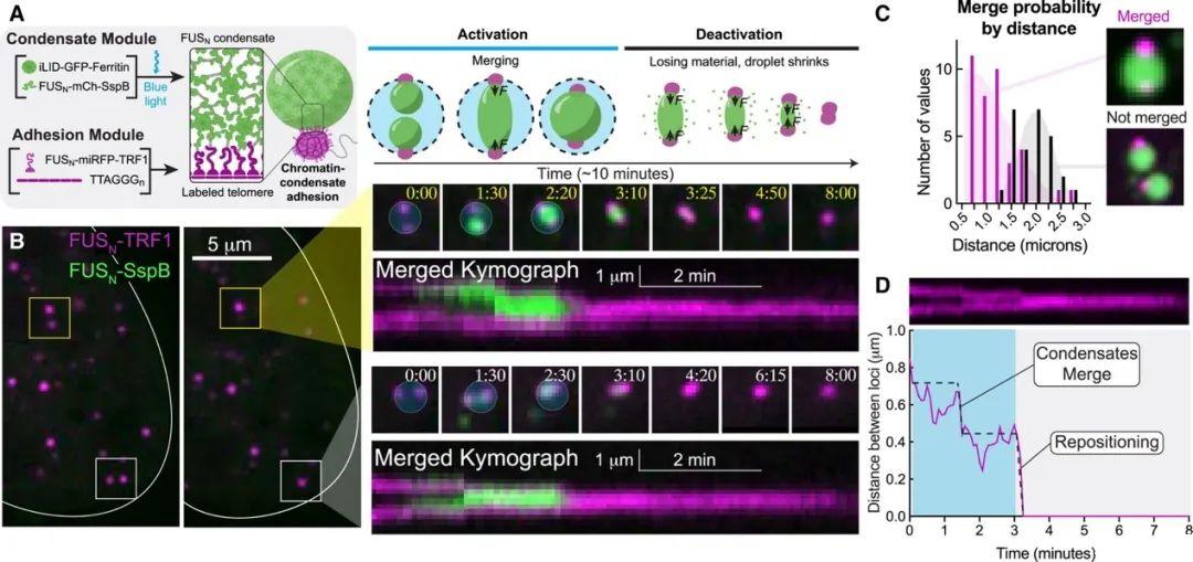 通過局部藍光激活,凝聚體可以在標記的位點上被誘導形成。在持續光激活下,錨定到兩個相鄰染色質位點的凝聚體會生長并融合為一個,并與目標位點保持關聯。在去激活后,凝聚體收縮產生拉力,導致這些位點重新定位(圖1A)。這種方法能使端粒成功地在多個微米的核空間內重新定位。然而,如果位點之間的距離超過2