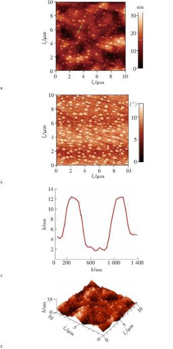 圖2a是探針在超純水中HOPG表面測得的力-位移曲線,當分離距離大于5 nm時,針尖和表面之間的作用力主要為斥力。由于實驗中的水呈弱酸性(PH約5.6),而研究表明,HOPG表面在弱酸性水中帶弱負電荷,探針針尖(單晶硅)在水中也認為是帶弱負電荷。因此,這個斥力可以解釋為雙電層(Electrostatic double layer,EDL)引起的。當分離距離小于5 nm時,在范德華力的作用下,針尖產生‘跳進’(jump in)現象并與HOPG表面接觸,整個力曲線符合DLVO理論。醇-水替換之后,在10 10掃描區域內采用Taping-Mode模式(95%的set-point)以1 Hz的掃描頻率,如圖3a所示,HOPG表面上生成的納米氣泡呈球冠狀,相應的三維圖如圖3d所示。