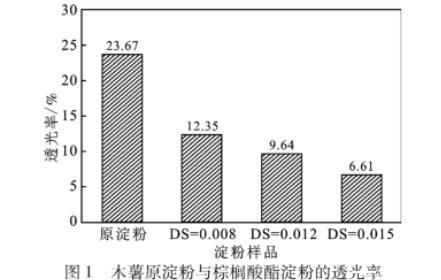 圖1木薯原淀粉與棕櫚酸酯淀粉的透光率