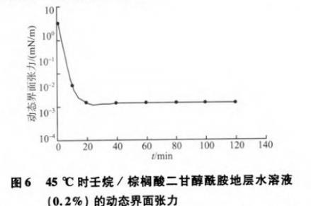 圖6 45℃時壬烷/棕櫚酸二甘醇酰胺地層水溶液(0.2%)的動態界面張力