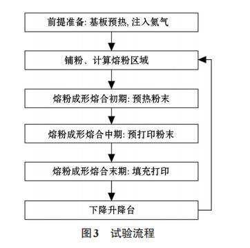 的當量直徑,μm;ni為當量直徑為di的顆粒的個數(shù)。計算可知,試驗粉末的算術(shù)平均直徑為65μm。再取100 mL的試驗粉料稱重,凈重為0.40 kg;計算得到試驗粉末體積孔隙率ε為0.49,因此粉末顆粒并非最緊密堆積狀態(tài)。熔粉制備了橫截面積為5 cm2,長5 cm的圓棒,每層鋪粉0.10 mm,實驗流程如圖3所示。