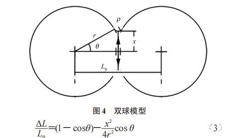 電子束熔粉與激光熔粉不同,因為電子束是以帶電粒子的定向運動產(chǎn)生的動能作為能量來源的,所以必須有導電回路才能不斷地轟擊工件。但粉末層是孔隙材料,導電性較差,因此在電子束接觸粉末的瞬間可能出現(xiàn)靜電潰散現(xiàn)象。為了確定熔粉初期的工藝模式,文章選用了雙球模型,計算不發(fā)生靜電潰散時的臨界線收縮量,結(jié)構(gòu)模型如圖4所示。計算公式如式(3)。