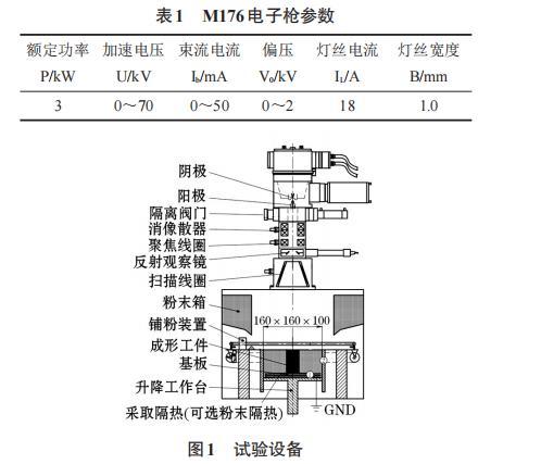 試驗設(shè)備為桂林獅達公司自制的THDW-3型電子束熔粉打印機,電子槍的型號為M176,電子槍真空度為5×10-2Pa,熔粉成形室注入氦氣之后的真空度為0.3 Pa。電子槍的參數(shù)如表1所示。成形設(shè)備如圖1所示。
