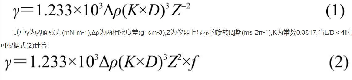 式中γ為界面張力(mN·m-1),Δρ為兩相密度差(g·cm-3),Z為儀器上顯示的旋轉(zhuǎn)周期(ms·2π-1),K為常數(shù)0.3817.當L/D<4時,可根據(jù)式(2)計算: