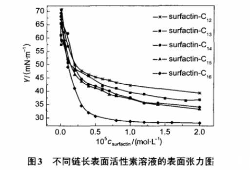 圖3不同鏈長表面活性素溶液的表面張力圖