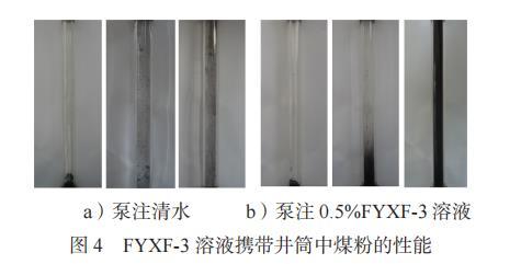 由圖4a)看出,裝有清水的有機玻璃管底部的煤粉沒有被懸浮,且泵注后,排出液中幾乎沒有攜帶出煤粉。由圖4b)看出,裝有0.5%FYXF-3溶液的有機玻璃管底部的煤粉被懸浮,且泵注后,排出液為黑色渾濁液體,攜帶出煤粉質(zhì)量為0.25g。可以看出,濃度為0.5%的FYXF-3溶液對煤粉的懸浮性能較好,可以將井筒堆積的韓城現(xiàn)場煤粉懸浮,并隨著返排液返排至地面。