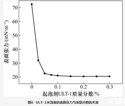 當(dāng)起泡條件相同時,起泡劑水溶液的表面張力越低,發(fā)泡體積越高。配制一系列濃度梯度的起泡劑ULT-1水溶液,利用接觸角/表面張力測量儀采用懸滴法測量表面張力與起泡劑ULT-1質(zhì)量分?jǐn)?shù)的關(guān)系,結(jié)果如圖6所示。從圖6可知:當(dāng)起泡劑ULT-1質(zhì)量分?jǐn)?shù)小于0.05%時,表面張力隨起泡劑ULT-1質(zhì)量分?jǐn)?shù)的提高快速降低;當(dāng)起泡劑ULT-1質(zhì)量分?jǐn)?shù)大于0.05%時,表面張力降幅越來越??;當(dāng)起泡劑ULT-1質(zhì)量分?jǐn)?shù)提高至0.2%時,表面張力降至20.40 mN/m,較蒸餾水降低了71.82%,繼續(xù)提高起泡劑ULT-1的質(zhì)量分?jǐn)?shù),表面張力不再降低。表明新型起泡劑ULT-1在較低濃度時即達(dá)到較低的表面張力,有利于提高發(fā)泡體積。