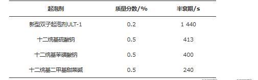 起泡性能主要是指起泡能力和泡沫穩(wěn)定性。發(fā)泡體積V0反映了起泡能力,析液半衰期t1/2反映了泡沫穩(wěn)定性。在室溫下,稱取一定質(zhì)量的起泡劑ULT-1于攪拌杯中,加入100 mL蒸餾水,置于攪拌器之上,以轉(zhuǎn)速11 000 r/min攪拌1 min。攪拌完畢后,立即取下攪拌杯,同時啟動秒表,開始記錄消泡時間,將攪拌杯中的所有物質(zhì)全部倒入1 000 mL量筒中,讀取發(fā)泡體積和從泡沫中析出50 mL液體的時間,即為半衰期。通過改變起泡劑ULT-1的質(zhì)量測量起泡性能與起泡劑質(zhì)量分?jǐn)?shù)的關(guān)系,結(jié)果如圖7所示。從圖7可知:隨起泡劑ULT-1質(zhì)量分?jǐn)?shù)的提高,發(fā)泡體積增加幅度較大,半衰期緩慢增加。當(dāng)ULT-1質(zhì)量分?jǐn)?shù)升到0.2%時,發(fā)泡體積達(dá)到501 mL,半衰期達(dá)到1 440 s,繼續(xù)提高質(zhì)量分?jǐn)?shù)發(fā)泡體積和半衰期基本不變,表明研制的新型起泡劑ULT-1低濃度時即具有較高的起泡性能,發(fā)泡體積高,泡沫半衰期長。同時,對比評價了常用起泡劑的半衰期,結(jié)果如表1所示。從表1可知:質(zhì)量分?jǐn)?shù)為0.2%的起泡劑ULT-1與質(zhì)量分?jǐn)?shù)為0.5%的常規(guī)起泡劑相比,泡沫半衰期可提高3倍以上。
