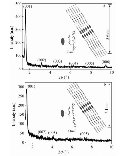 在2θ=2°~10°范圍內(nèi)出現(xiàn)的多個等距離Bragg衍射峰表明得到的CODA和CO2DA LB膜具有很好的周期性結(jié)構(gòu)。假定從左至右Bragg衍射峰依次為(001),(002),...,(006),用Bragg方程對各級衍射峰進(jìn)行計算可得CODA和CO2DA LB膜層狀結(jié)構(gòu)間距為5.6nm和6.1nm。CO2DA LB膜的Bragg衍射峰較寬,強度較弱,Bragg衍射峰隨角度的增大衰減很快,說明CO2DA LB膜中分子排列較CODA LB膜中松散,存在局部的缺陷。理論計算充分展開的CODA和CO2DA分子鏈長約為3.5nm和3.6nm,所以觀察到的周期結(jié)構(gòu)包含雙層的CODA和CO2DA分子。我們可以預(yù)想雙層結(jié)構(gòu)的中間區(qū)域是香豆素基團(tuán)經(jīng)過強烈的π-π堆積作用形成的,而雙層結(jié)構(gòu)單元的外部為烷基側(cè)鏈。香豆素取代二乙炔單體的規(guī)則排列是二乙炔單元進(jìn)行拓?fù)渚酆系南葲Q條件。
