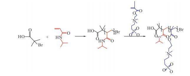 首先將a-溴代異丁酸(0.0167g,相當于0.1mmol)、NIPAM單體和5mL去離子水加入至真空反應管I中。隨后,利用超聲處理直至所有固體組分完全溶解,充入氮氣作為保護氣持續10min。另外,在真空反應管II中添加CuBr(0.0036g,0.025mmol)和2mL去離子水,進一步加入Me。TREN配體(13.4μL,0.05 mmol)和PMDETA配體(8.9μL,0.05mmol),充入氮氣保護10min。在保持氮氣氛圍的條件下,使用真空注射器將真空反應管I中的內容物轉移到真空反應管II中并進行密封,反應30min。此外,在真空反應管III中將甜菜堿單體和5mL去離子水混合,經過超聲處理直到完全溶解,充入氮氣保護10min。NIPAM聚合反應啟動1h后,再將真空反應管III中的物質通過真空注射器,在氮氣保護下加入到反應管II中,繼續反應2h以確保反應徹底完成。反應完成后,將反應液置入截留分子量為3500的透析袋中,用去離子水透析48h,每8h更換一次水。最終,將透析后的溶液進行冷凍干燥處理,去除所有水分,從而得到最終產物。在整個合成過程中,控制加入的單體總的物質的量為10mmol,根據NIPAM的加入比例(分別為100%,80%,50%,40%,20%和0%)合成了一系列P(NIPAM-b-DMMPPS)嵌段聚合物。這些聚合物根據其NIPAM的比例命名為PN_100,PN_80,PN_50,PN_40,PN_20和PN_0,以便于后續的實驗分析與研究。精確控制實驗條件和原料比例。聚合過程如Scheme1所示。