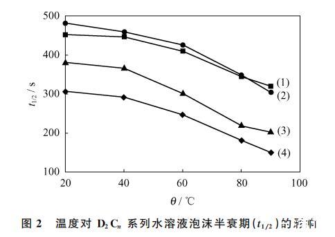 由圖1和圖2可知,隨著溫度的升高,D2C水溶液的初始起泡體積先增加,在60℃達到最大值后又有所下降,但是上升和下降的幅度不大;隨著溫度的上升,D2C水溶液的泡沫半衰期顯著下降。這是由于在一定的溫度范圍內(nèi),隨著溫度的升高,液體膨脹,分子間距離增大,表面活性劑分子動能增加,易擺脫水的束縛逃逸到水面,表面吸附量增加,起泡能力增強。另外,泡沫在低溫和高溫下的衰變過程不同。低溫時,主要是氣體擴散過程;高溫時,由于最上面的泡膜上側總是向上凸的,這種彎曲面有利于蒸發(fā),溫度越高蒸發(fā)越快,液膜越來越薄,最后自行破滅,因此泡沫破滅由頂端開始。從起泡體積和泡沫半衰期隨溫度的變化曲線來看,D2C系列中D2C2的變化趨勢最為平緩,即抗溫能力最好。