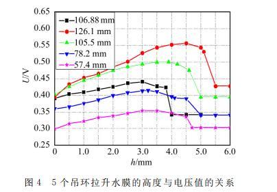 圖2是WBM-1A拉脫法液體表面張力實驗儀,用來測定純凈水的表面張力系數。實驗時采用標準吊環的內、外徑分別為d1=33.10 mm,d2=34.96 mm,平均直徑為d?=34.03 mm,平均周長為πd?=106.88 mm。該標準環拉出的水膜高度與力敏傳感器電壓讀數之間的關系,如圖3所示。可以看出,隨著水膜高度的增加,吊環拉力逐漸增加到最大(圖中Umax表示),然后慢慢減小,直至水膜斷裂。圖中U斷前和U斷后分別表示水膜斷裂時和斷裂后的瞬時電壓值。吊環的受力變化情況與之前理論分析一致。