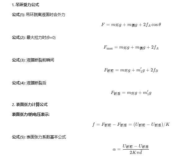 很顯然,對比式(3)和(4),液膜斷裂前、后的拉力之差為2fB,這正是液膜斷裂點的表面張力,計算出的表面張力系數是準確的。同樣,對比式(2)和(4),吊環拉力之差為2fA + (m膜 - m1′)g,此差值中除了有表面張力外,還包含一部分液膜重力,所以計算出的表面張力系數數值將明顯偏大。因此文獻中普遍采用液膜斷裂點來計算表面張力系數。