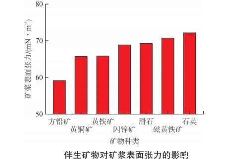 對礦漿濃度為 30%的黃銅礦、方鉛礦、滑石、閃鋅礦及石英的礦漿表面張力進行了測定。在 pH=7、粒度-0.074 mm占比 80%的條件下,考察了黃鐵礦與磁黃鐵礦及伴生礦物質量比為 7∶3時,不同伴生礦物對礦漿表面張力的影響,。結果發(fā)現(xiàn):不同礦物的礦漿表面張力存在差異,具體為石英 72.17 mN/m、磁黃鐵礦 70.72 mN/m、滑石 69.31 mN/m、閃鋅礦 68.88 mN/m、黃鐵礦 65.89 mN/m、黃銅礦 65.72 mN/m、方鉛礦 59.14 mN/m。分析結果表明,方鉛礦的礦漿表面張力最低,而石英的礦漿表面張力與水的表面張力(72.80 mN/m)最為接近。