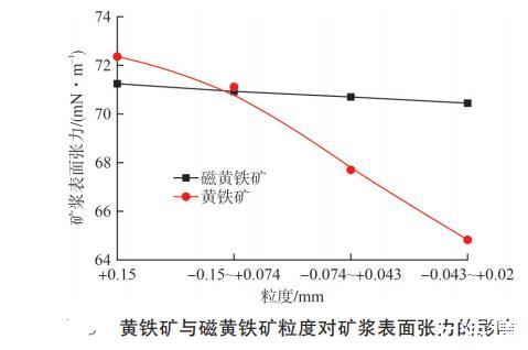 結果發(fā)現(xiàn):粒度越細,礦漿表面張力越小。隨著粒度從+0.15 mm降低至-0.043~+0.02 mm,黃鐵礦礦漿表面張力下降較為明顯,從 72.35 mN/m降低至 64.83 mN/m;磁黃鐵礦礦漿表面張力下降幅度較小,礦漿表面張力從71.24 mN/m降低至70.46 mN/m。