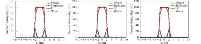 圖4 不同復(fù)配體系下z軸方向的數(shù)密度分布