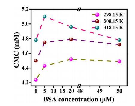 圖1. 不同溫度下[C10-4-C10im]Br2的CMC隨BSA濃度的變化。