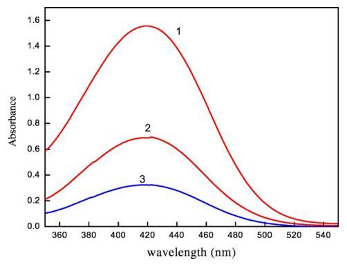 圖7.含有不同體積百分比二甘醇-水混合物(1)5 v/v%二甘醇-水(2)10 v/v%二甘醇-水和(3)15 v/v%二甘醇-水的CET/[C10min][Cl]膠束聚集體中含水鉻吸收光譜的變化。
