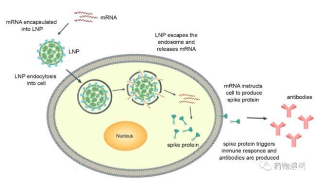 脂質(zhì)納米粒最新的成功案例是作為遞送載體用Pfizer/BioNTech和Moderna獲FDA批準(zhǔn)的兩種COVID-19信使RNA(mRNA)新冠疫苗,這兩款疫苗以無(wú)與倫比的速度開(kāi)發(fā)上市,并在流行病毒預(yù)防方面有著顯著的效果。疫苗將編碼SARS-CoV-2刺突蛋白的mRNA遞送到宿主細(xì)胞的細(xì)胞質(zhì)中,被翻譯成刺突蛋白充當(dāng)抗原,對(duì)病毒產(chǎn)生免疫反應(yīng)。