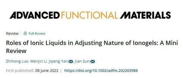 北京理工大學生命學院綠色生物制造課題組在國際頂級期刊《Advanced Functional Materials》(影響因子18.808)發表題為《Roles of Ionic Liquids in Adjusting Nature of Ionogels:A Mini Review》的綜述,文章綜述了離子液體在調控離子凝膠的結構和性能方面發揮的作用。該文章通訊作者為閻繼鵬副教授和孫劍教授,第一作者為北京理工大學生命學院2020級碩士生羅志鴻。
