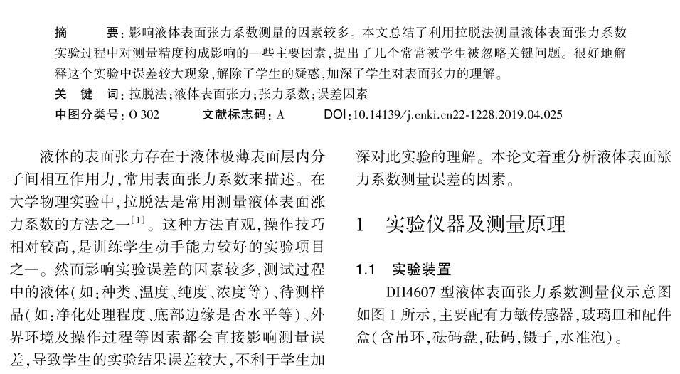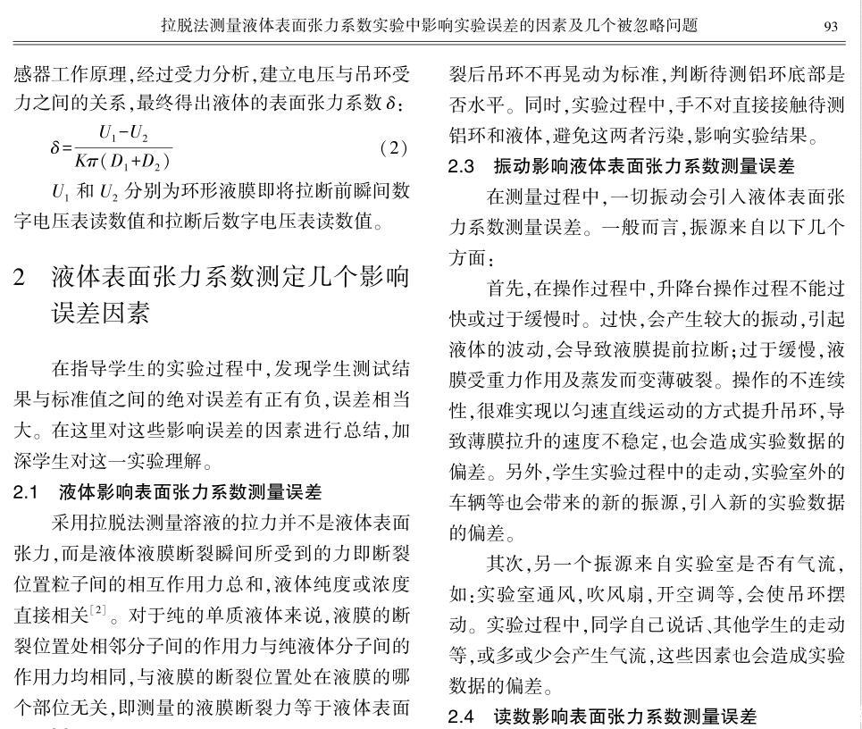 【摘要】:本文對拉脫法測試液體表面張力系數中吊環的水平、液膜質量、傳感器定標范圍和電壓測量點四個造成實驗誤差的相關因素進行分析。采取帶有水平儀的輕質三角形薄片對吊環進行簡單改進,使純水的表面張力系數百分誤差減少了3.97%。并結合教學經驗,對學生實驗過程中易忽視問題進行詳細說明,希望為進一步的物理實驗教學提供借鑒意義。