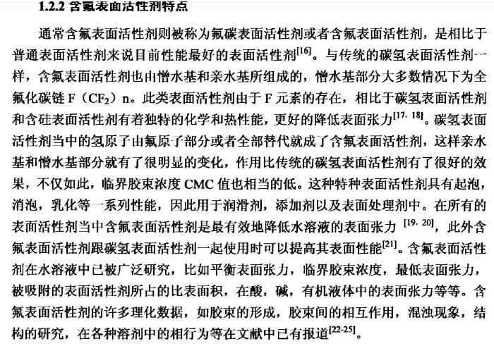 【摘要】:本論文首先對新型含氟表面活性劑的特性,應用領域,國內外研究進展進行了全面的綜述。含氟表面活性劑是目前最受青睞的特種表面活性劑,相比于傳統的碳氫表面活性劑,含氟表面活性劑的用量少,降低水溶液表面張力的作用強,同時可以跟其它表面活性劑起到很好的復配效果,可以應用于消防、鉻霧抑制劑、造紙、冶金、起泡與消泡劑的合成等很多領域。