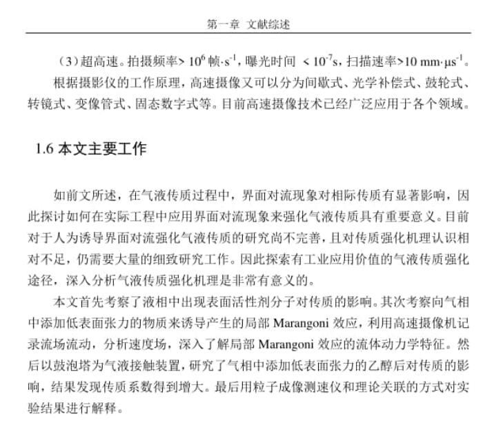 首先,研究了在液相中添加三種不同臨界膠束濃度的表面活性劑對氣液比表面積和傳質系數的影響。實驗結果表明,表面活性劑在氣液界面聚集,會增大氣液比表面積,但由于膠束現象的存在,會減小CO2吸收的總包傳質系數和液相傳質系數,因此臨界膠束濃度是表面活性劑的一個重要參數。其次,研究了向氣相加入低表面張力物質(乙醇和正丙醇)對氣液兩相傳質的影響,并探討增強傳質過程的途徑。氣相低表面張力物質的添加,使液體表面出現了局部流動現象。通過高速攝像技術進行拍攝,并采用軟件進行處理,得到了局部Marangoni對流現象的速度分布。進而證實了在氣相中添加低表面張力物質能夠誘導產生局部Marangoni對流現象。然后利用鼓泡塔傳質裝置,研究了氣相中加入少量乙醇對水-CO2吸收過程傳質的影響。CO2氣體中添加少量乙醇后,鼓泡塔中的氣泡尺寸變大,氣泡比表面積變小,而液相傳質系數增大,綜合結果促進了氣液傳質。