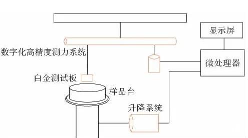 圖1為表面張力儀工作系統示意圖。硬件方面主要包括樣品臺、升降系統、數字化測力系統和微處理器。軟件方面由控制、分析專用軟件經過微處理器的一系列運算,將檢測到的微力轉化成表面張力值。由LCD數字顯示屏實時輸出表面張力值,如果需要,可通過RS232接口連接打印機,打印數據或經計算機采集相應數據。該裝置結構簡單,操作簡便,準確性高。