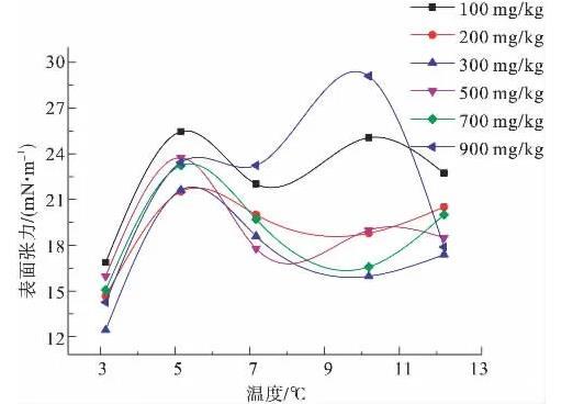 圖5為100、200、300、500、700、900 mg/kg濃度下,陰離子表面活性劑CTAB溶液的表面張力隨溫度變化示意圖。由圖5可知,300 mg/kg溶液的表面張力曲線最低,說明該濃度的溶液表面活性最強。在所測溫度范圍內,隨溫度升高表面張力變化較大,整體上表面張力曲線呈波浪狀,出現拐點。6條曲線在3℃時均出現最低表面張力值,在5℃附近均出現波峰;100、500和900 mg/kg溶液在7℃附近時出現波谷,10℃附近再次出現波峰;200、300和700 mg/kg溶液在10℃附近出現波谷。