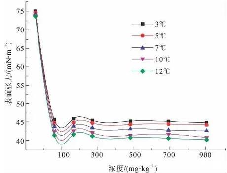 圖2為3、5、7、10、12℃下,陰離子表面活性劑CTAB溶液的表面張力隨濃度變化示意圖。由圖2可知,CTAB是比較優良的表面活性劑,在低濃度下就能夠顯著降低溶液表面張力,在300 mg/kg-1時表面張力達到最低值,之后隨濃度增大,表面張力變化不大,因此CTAB的臨界膠束濃度CMC即在此濃度范圍附近。在所測溫度范圍內,當CTAB溶液達到CMC以后,表面張力值在14.5~23.5 mN/m之間。隨溫度變化,表面張力值相差較大。